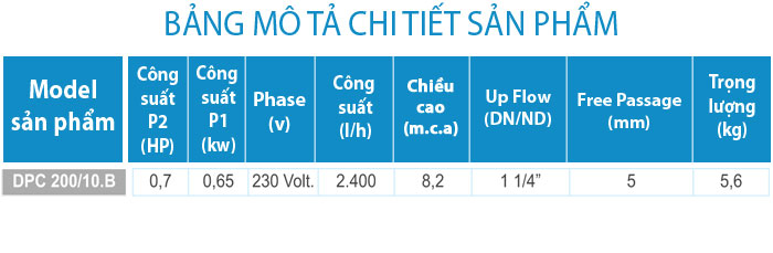 - Bơm chìm Model DPC, mức tối thiểu của nước là 3mm.