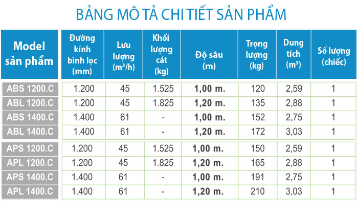- Thành phần lọc: silex, silex-hydroanthracite