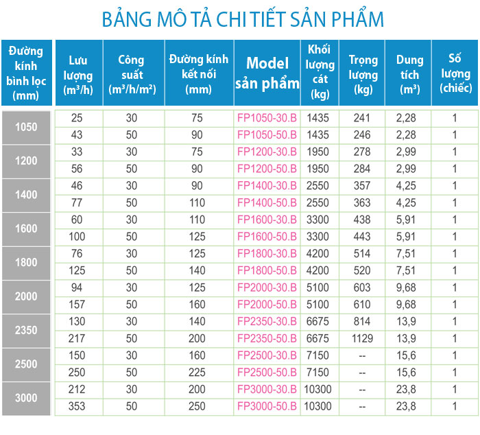 - Công suất lọc: 30 m3/h/m2