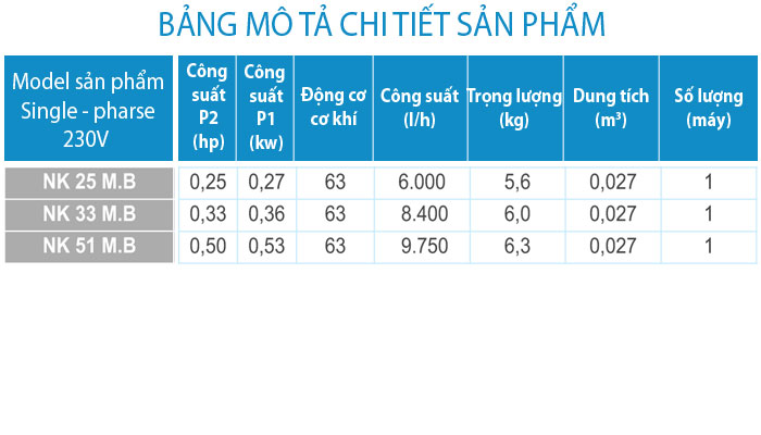 - Động cơ: IP 55 bảo vệ, lớp cách điện F, 50 Hz, 2.850 rpm, Các máy bơm này thích hợp sử dụng với nước biển.