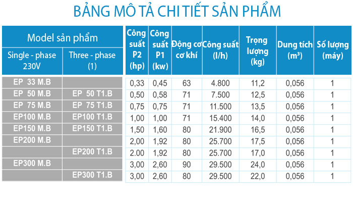 - Động cơ: IP 55 bảo vệ, lớp cách điện F, 50 Hz, 2.850 rpm. Các loại máy bơm này thích hợp sử dụng với nước biển.