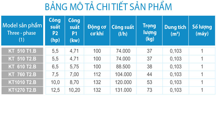 - Động cơ: IP 55 bảo vệ, lớp cách điện F, 50 Hz, 2.850 rpm