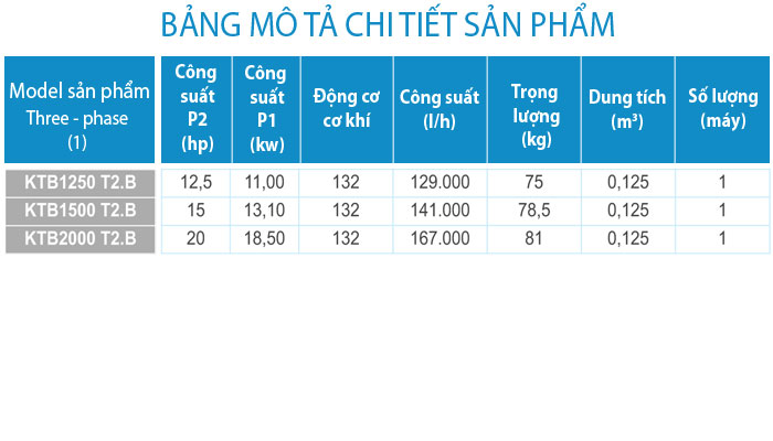 - Động cơ: IP 55 bảo vệ, lớp cách điện F, 50 Hz, 2.850 rpm
