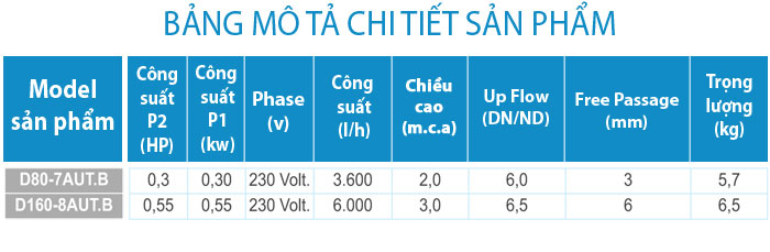 - Bơm nước model DRENOX có mức nước tối thiều là 3mm (D80-7.B) hoặc 7,5mm (D160-8.B)