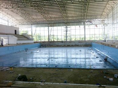 Khởi công từ ngày 12-12-2012, dự kiến hoàn thành trong tháng 8-2014. Đến ngày 20-6-2014, các nhà thầu đã thi công đạt khoảng 90%khối lượng công trình. Công trình bể bơi có mái che có tổng mức đầu tư trên 113tỷ đồng do Sở VH, TT và DL làm chủ đầu tư. Đến nay, tổng kinh phí Nhà nước cấp là 100/113 tỷ đồng. Nhà thầu đã thi công 95% tổng khối lượng công trình gồm ép cọc ly tâm; đóng cọc tre, đệm cát, xử lý nền; lắp dựng cốt thép, ván khuôn và đổ bê tông móng đáy bể bơi lớn, bể bơi nhỏ, lắp đặt hoàn thiện phần công nghệ, khán đài… Nhìn chung tiến độ xây dựng Nhà thi đấu đa năng so với tiến độ kế hoạch đạt do nhà thầu tập trung nhân lực, chủ động nhập khẩu, lắp đặt thiết bị chuyên môn cao. Trong quá trình thi công, các nhà thầu đã tuân thủ các yêu cầu, quy trình kỹ thuật theo đúng thiết kế nên chất lượng các công trình đều bảo đảm. Ban quản lý dự án và đơn vị tư vấn giám sát tăng cường trách nhiệm, thường xuyên nhắc nhở nên các đơn vị thi công đều bảo đảm an toàn lao động. Sở VH, TT và DL cũng đề nghị UBND tỉnh cho ứng vốn dự án Nhà thi đấu đa năng để thanh toán phần giá trị khối lượng đã thực hiện và nhập khẩu thiết bị máy móc để hoàn thành sớm công trình đưa vào sử dụng; đề nghị các ngành chức năng nhanh chóng thực hiện Dự án hạ tầng phục vụ Nhà thi đấu đa năng và bể bơi có mái che để các công trình hoàn thành đúng tiến độ kế hoạch.